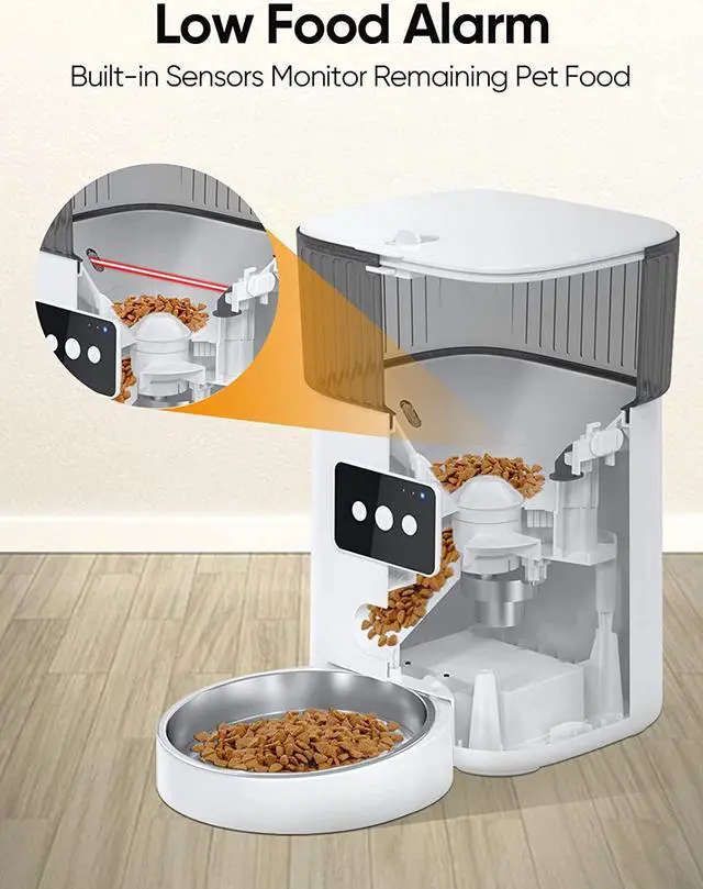 LOW FOOD ALARM: There is a built-in sensor to detect remaining food storage. When the remaining food storage is low. There will be a notification sent to App.