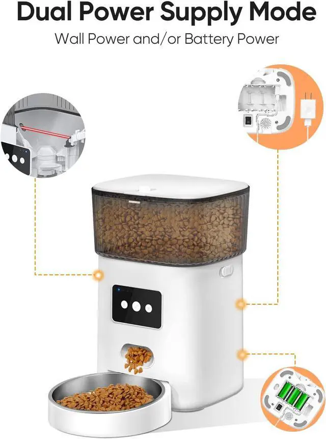 DUAL POWER SUPPLY MODE: It can be used directly after being plugged in, which is convenient and fast. The automatic pet feeder could also be powered for backup batteries to prevent the risk from a power cut.