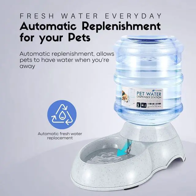Automatic pet watering system with gravity fed design that replenishes your pet's water supply when it reaches low water level