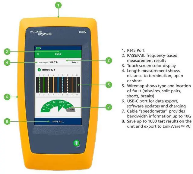The Fluke LIQ-100 LinkIQ Cable + Network Tester is a professional-grade tool designed to verify and troubleshoot Ethernet cabling and network connectivity. It combines advanced cable testingsupporting performance up to 10Gb/swith detailed network diagnostics, including switch port identification, VLAN info, and IP connectivity via IPv4 and IPv6. The LIQ-100 also features comprehensive PoE testing for classes 0 through 8, along with wire mapping, distance-to-fault location, and a tone generator for cable tracing. With a bright color touchscreen, USB-C connectivity, and storage for up to 1, 000 test results, it delivers fast, accurate results in a rugged, user-friendly package ideal for IT professionals and network technicians.