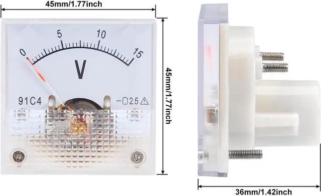 specifications Volumn:45mm x 45mm x 36mm/1.77inch x 1.77inch x 1.42inch(L*W*T) Model:91C4 Net Weight:32g Working Range:DC 0~15V Graduation: 0.5V With blots and screw for fixing. Package Content:1 X Voltage Gauge