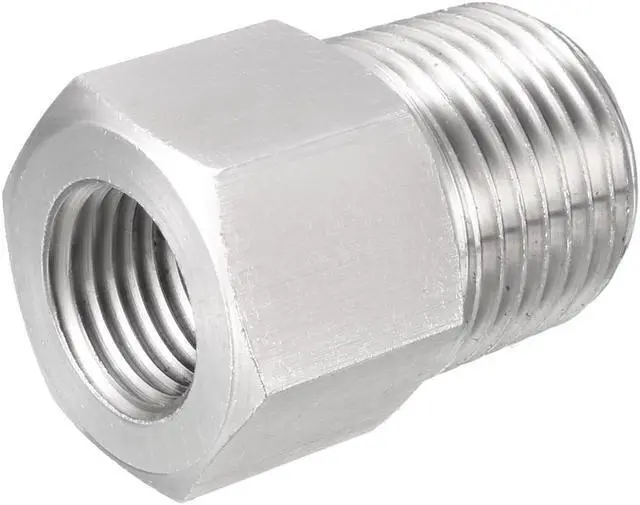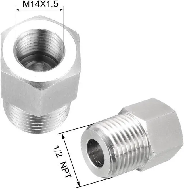 2.1/2" NPT male threads on one end and female M14X1.5 threads on the other for connecting pipes with different ends.