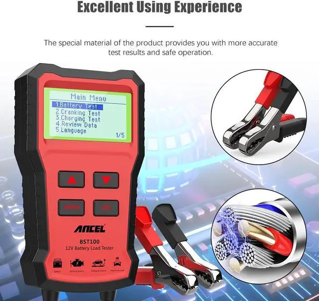Ancel BST100 battery tester is used for testing the conditions of the 12V lead-acid starting battery: cranking system and charging system. It comes with a large backlight LCD screen and it supports classic touch-tone to help you read and operate more efficiently. It utilizes the 4-wire Kelvin method to complete the collection of a series of complicated data for calculating every testing data with a build-in precise circuit and improved digital processor. Moreover, some circuit improvements including polar reversal protection, over-voltage input protection, and loose lead detection, ensure safety and convenience during testing.