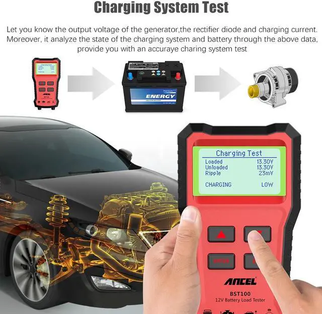 ----AncelBST100Description: 1. Identify battery status Good or Replace 2. Check Battery Capacity - Cold Cranking Amps (CCA), DIN, EN and IEC information relative to battery rating. 3. Check Internal resistance value (Ohm) 4. Display battery life in percentage (%) 5. Battery Cranking Test, load test 6. Battery Charging Test, Ripple Test 7. Support battery ripple test and review test data ----BST100 12V