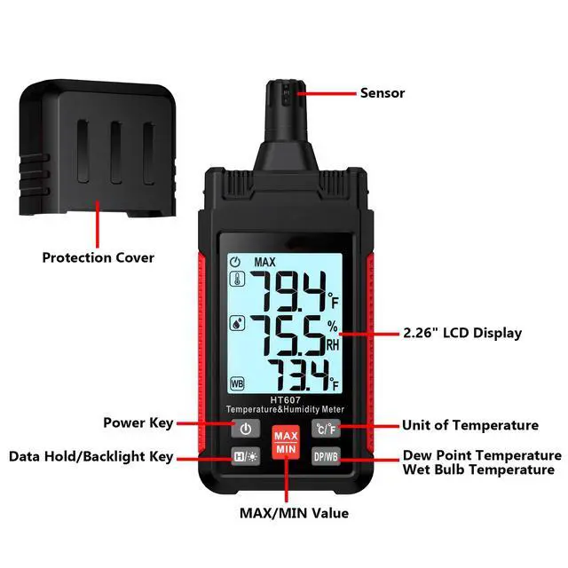 [High-precision Psychrometer Thermo-Hygrometer] This Digital thermometer psychrometer is designed to combine the functions of humidity meter, temperature meter, wet bulb temperature and dew point temperature. Equiped with / conversion, data hold, backlight, LCD display, low battery indicator, automatic shutdown, max and min value functions. This temperature and humidity meter can perfectly meet your different needs in daily use