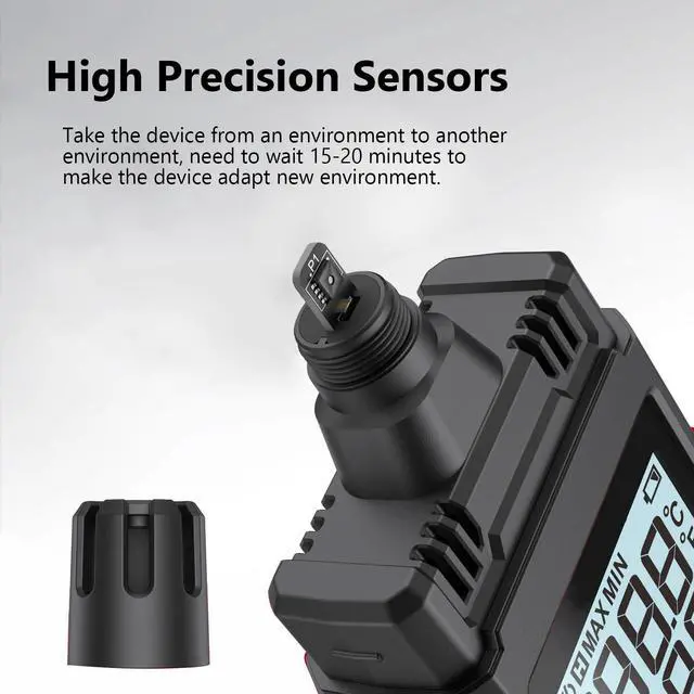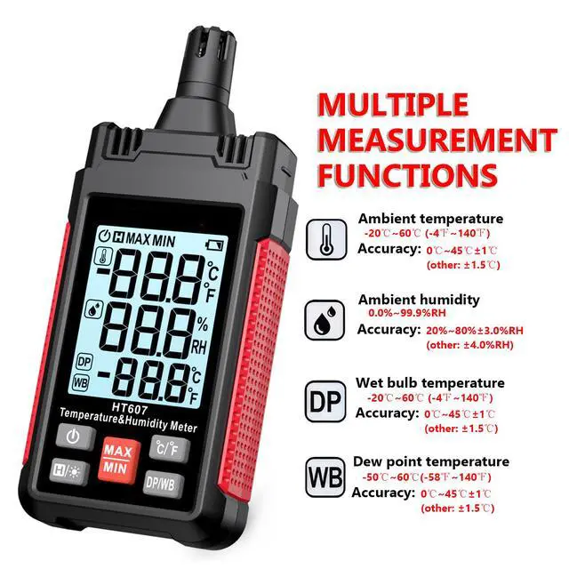 [Accurate Measuring Humidity & Temperature] Ambient temperature range: -20~60 (-4~140), ambient temperature accuracy: 0~45±1 (other: ±1.5). Ambient humidity range: 0.0%~99.9%RH, ambient humidity accuracy: 20%~80%±3.0%RH (other: ±4.0%RH). Wet bulb temperature range: -20~60 (-4~140), wet bulb temperature accuracy: 0~45±1 (other: ±1.5). Dew point temperature range: -50~60(-58~140), dew point temperature accuracy: 0~45±1 (other: ±1.5)
