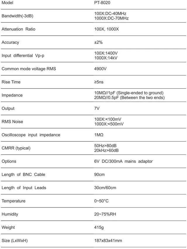 • Package Included: PT-8002 differential probe x 1, Adapter x 1, Probe Hook x 2, Manual x 1. PINTECH offers 1 Year warranty, you can contact us if you have any questions!