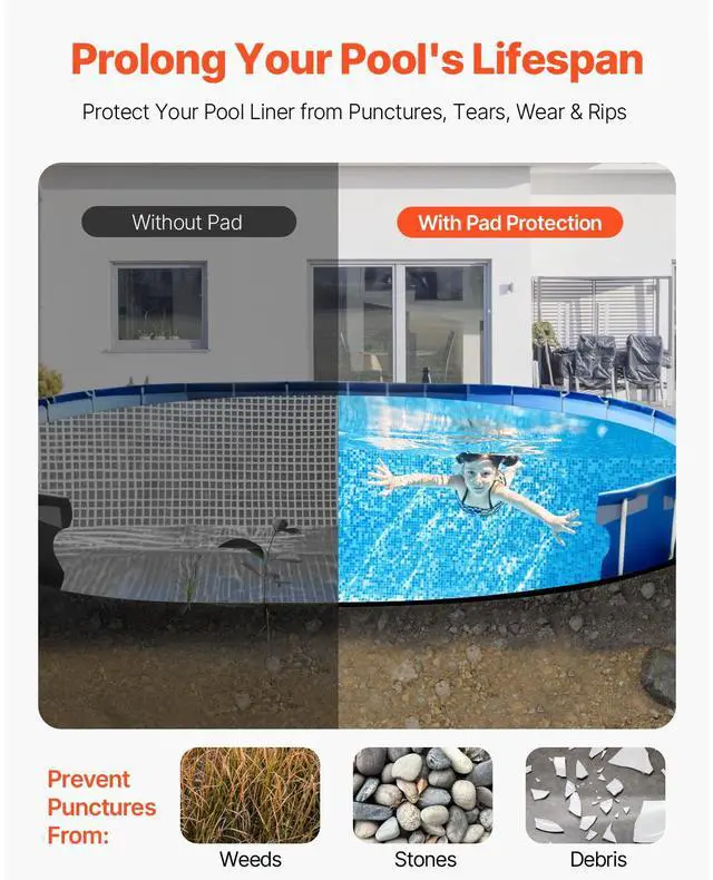 Extra-thick for Comfortable Experience: Made from extra-thick and high-strength non-woven geotextile, this pool liner pad for above ground pool provides excellent cushioning, making walking comfortable. The extra-thick design blocks weeds and keeps the water clean, eliminating the hassle of cleaning.