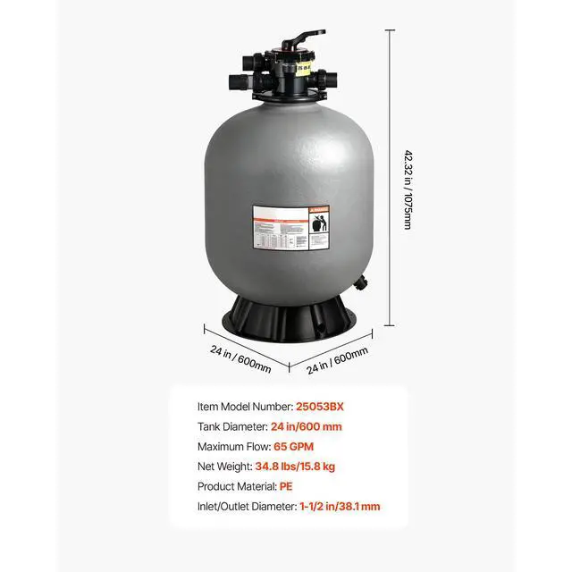Item Model Number: 25053BX Tank Diameter: 24 in/ 609.6 mm Maximum Flow: 65 GPM/ 246.1 LPM Product Material: PE Inlet/Outlet Diameter: 1-1/2 in/ 38.1 mm