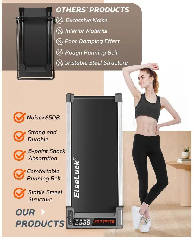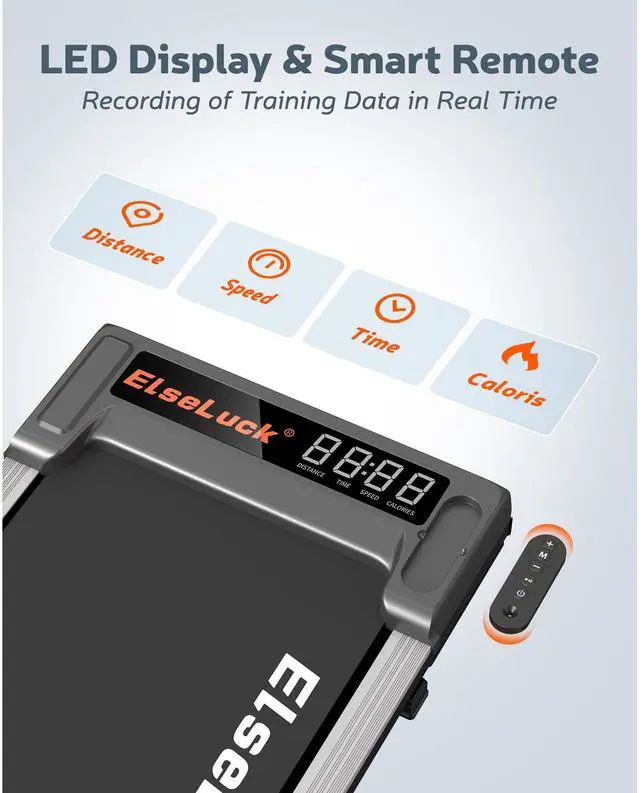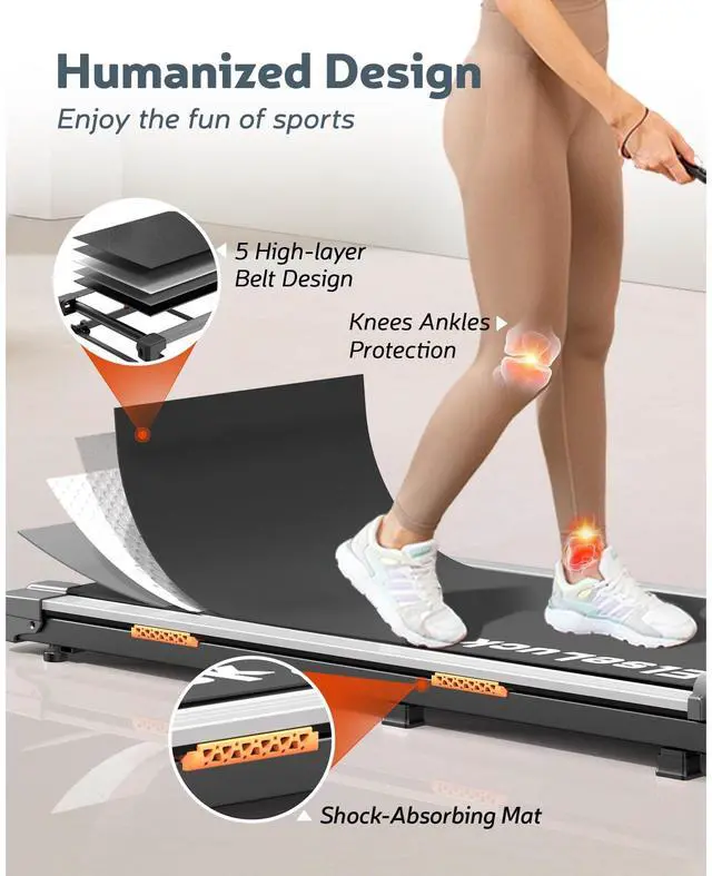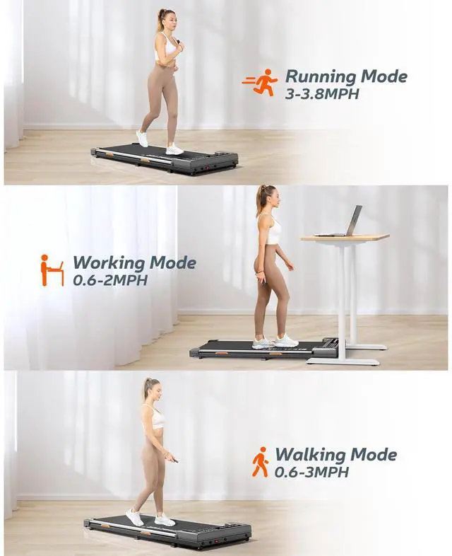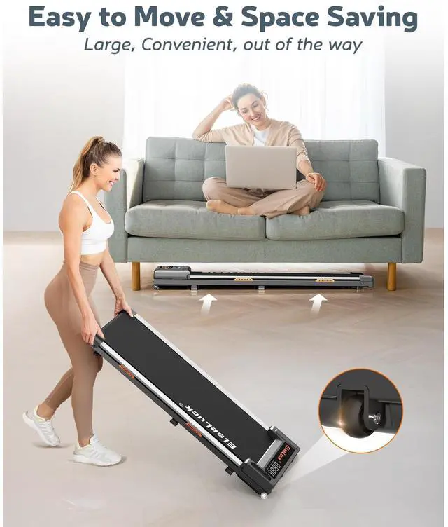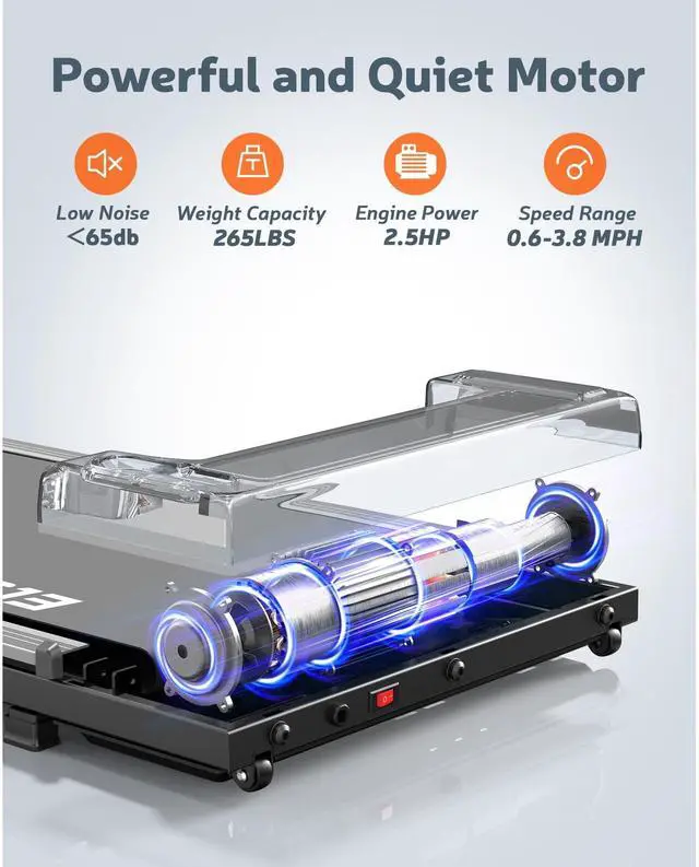 Stay active at home or in the office with the Walking Pad Treadmill. Its ultra-quiet 2.5HP motor, cushioned 5-layer belt, and shock-absorbing design make walking, working, or light jogging comfortable and safe. LED display and remote allow easy tracking, while the slim, portable design rolls away under a desk, bed, or sofa for space-saving convenience. Supports up to 265 lbs.