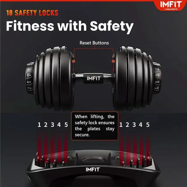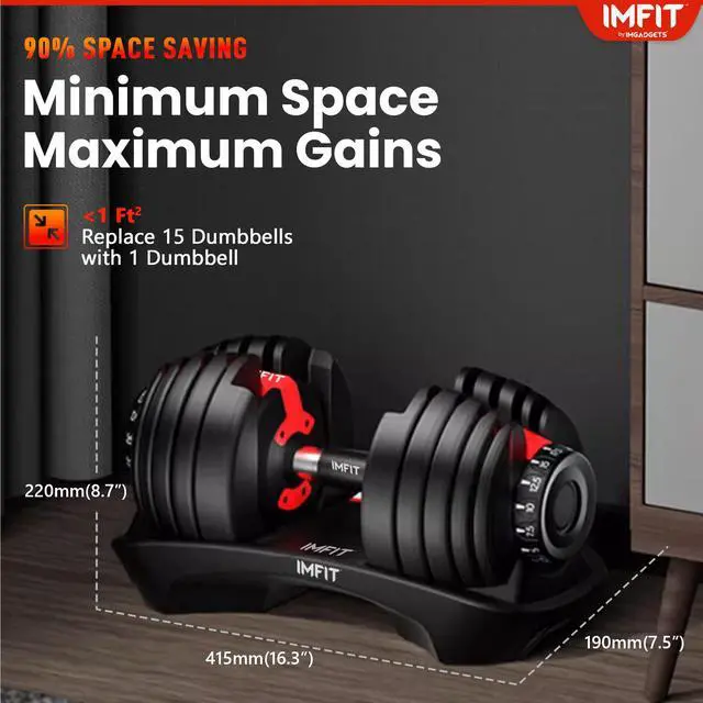 Space-efficient and Quieter Workouts - The compact design of IMFIT portable and adjustable dumbbells allows for efficient use of space, enabling you to perform a wide range of exercises within the comfort of your home. No more clutter from multiple dumbbells holding onto your space. This makes IMFIT adjustable dumbbells ideal for home use, yoga clubs, sports centers, gyms, and home fitness routines. The durable dumbbell molding around the metal plates ensures smooth lifting, resulting in quieter workouts.