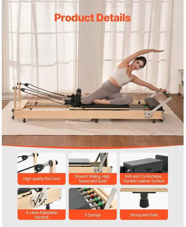 Foldable Pilates Reformer, Wooden Pilates Workout Machine for Home Gym Studio Use, Pilates Bed with Dual Resistance- Spring & Cord, Reformer Set with Sitting Box, Up to 400 LBS