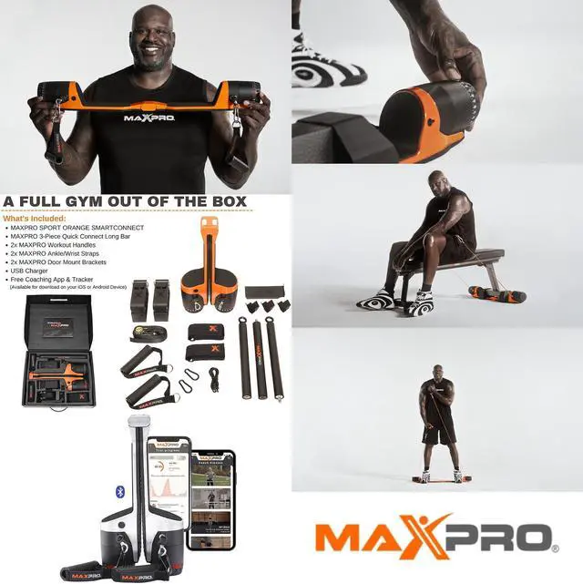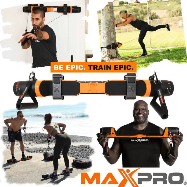 Included Items: MAXPRO 3-piece Quick Connect Long Bar MAXPRO Workout Handles - 2 MAXPRO Ankle/Wrist Straps - 2 MAXPRO Door Mount Brackets - 2 USB Charger *CES 2020 INNOVATION AWARD PRODUCT Awarded January 2020 by the Consumer Technology Association Cardio, strength, circuit, HIIT (Tabata) & suspension training are all possible with MAXPRO. It is the ultimate workout machine. The MAXPRO isnt some rubber band tied to a door. It is a serious compact cable machine that replaces numerous bulky cable machines found in your typical gym. MAXPRO brings you the latest revolutionary fitness technology. It is time to take your workout to the max with MAXPRO Fitness! Expand your workout with MAXPRO's ecosystem of products & transform your space into a complete home gym like nothing else but can be stored away to make space for lifes other activities. Truly Portable Gym Inspired by products as varied as Italian sports cars, hoverboards, and athletic shoes. Providing both strength training and cardio easily target your favorite muscle groups... glutes, abs, arms, chest, and back. Benefits of Concentric Only Training MAXPRO is extremely effective at building muscle, with many studies validating its unique concentric resistance profile as having equal muscle building and muscle toning effect when compared to other traditional forms of resistance training.