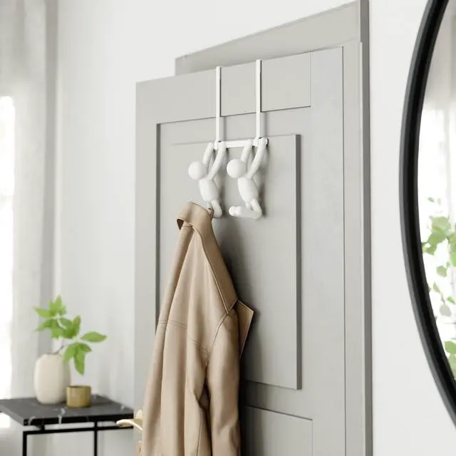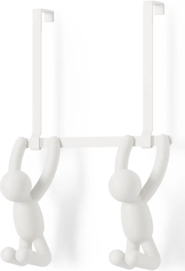 Buddy Over-the-Door Double Hook features Umbra's signature buddy figurine, this time as an over the door hook, great for storing belonging like hats, scarves, coats and purses. This decorative piece has a more active look then your typical hook, since buddy looks like he's in motion. Molded with a matte finish, and measures 8.5 x 12 x 4.25" ( 21.6 x 30.5 x 10.8 cm). Keep items you need regular access to - easily on hand with this playful and decorative hook.
