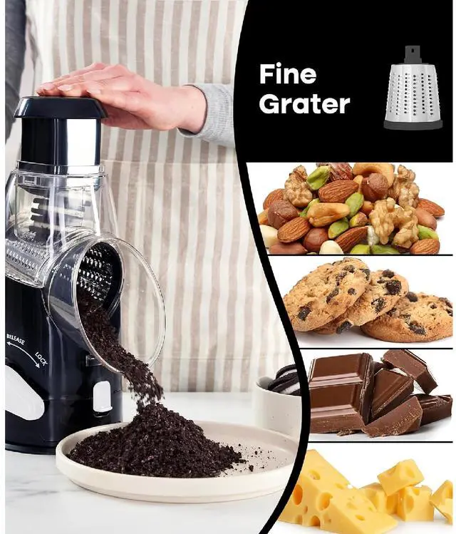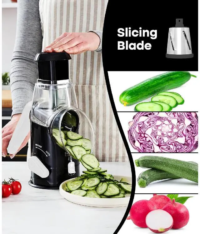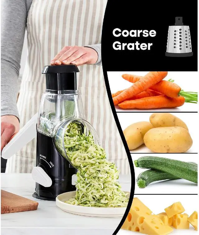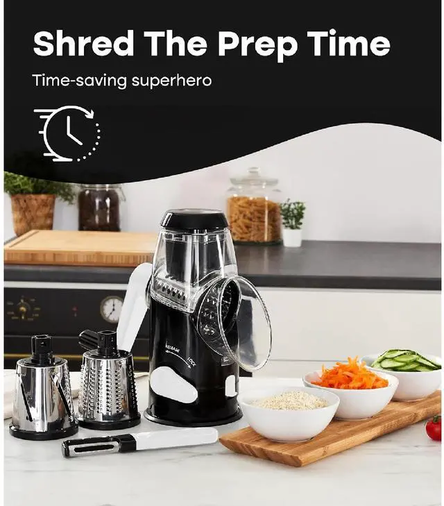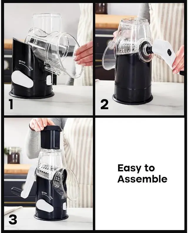 Grate cheese and slice vegetables effortlessly with this Rotary Cheese Grater. This user-friendly kitchen tool features a non-slip suction base for stability and interchangeable stainless steel blades for versatile shredding and slicing. Perfect for quick, mess-free meal prep.