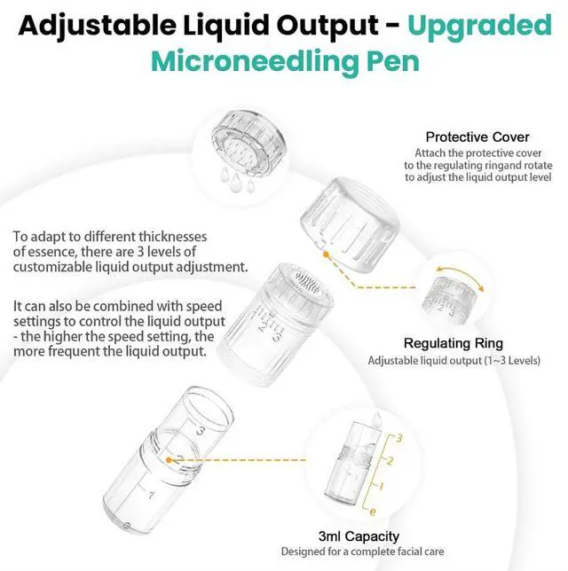 The Dr. Pen H5 features a detachable serum container that makes applying serums easier and ensures even distribution across the skin. With automatic 360° coverage and adjustable liquid flow settings, you can customize the flow to suit different serum thicknesses using its 1-3 level adjustment. This design ensures a smooth and consistent application and prevents reverse flow, enhancing the effectiveness of treatments.