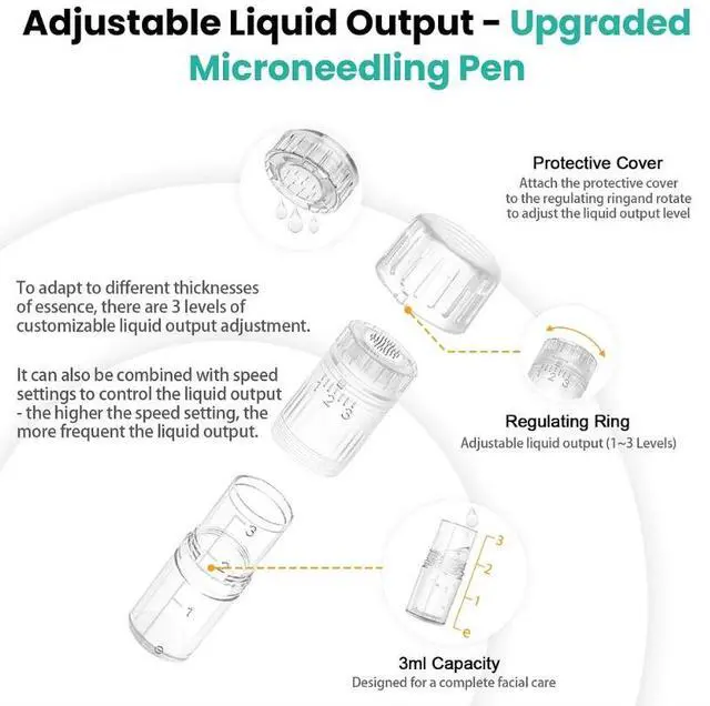 The Dr. Pen H5 features a detachable serum container that makes applying serums easier and ensures even distribution across the skin. With automatic 360° coverage and adjustable liquid flow settings, you can customize the flow to suit different serum thicknesses using its 1-3 level adjustment. This design ensures a smooth and consistent application and prevents reverse flow, enhancing the effectiveness of treatments.
