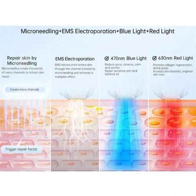 Triple-Effect Rejuvenation: The Q2 harnesses the power of Microneedling, EMS Electroporation, and LED therapy to provide comprehensive skin rejuvenation, targeting multiple concerns simultaneously.