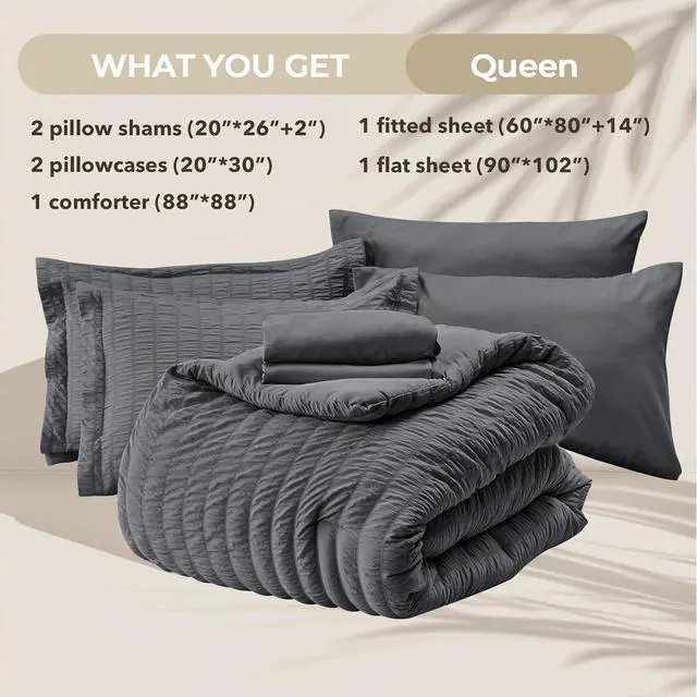 [WHAT YOU GET] - The queen size bed set includes 1 Comforter (88" x 88"), 2 pillowcases (20" x 30"), 2 Pillow Shams (20" x 26" x 2"), 1 Fitted Sheet (60" x 80" x 14"), 1 Flat Sheet (90" x 102"). Our comforter set is packed in a vacuum bag, so you can dry them in low heat or tap the comforter gently while baking it in the sun to fluffy again.