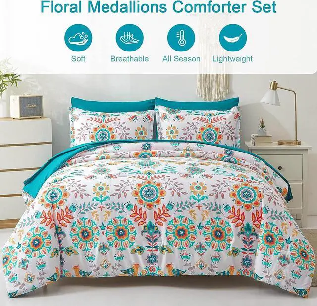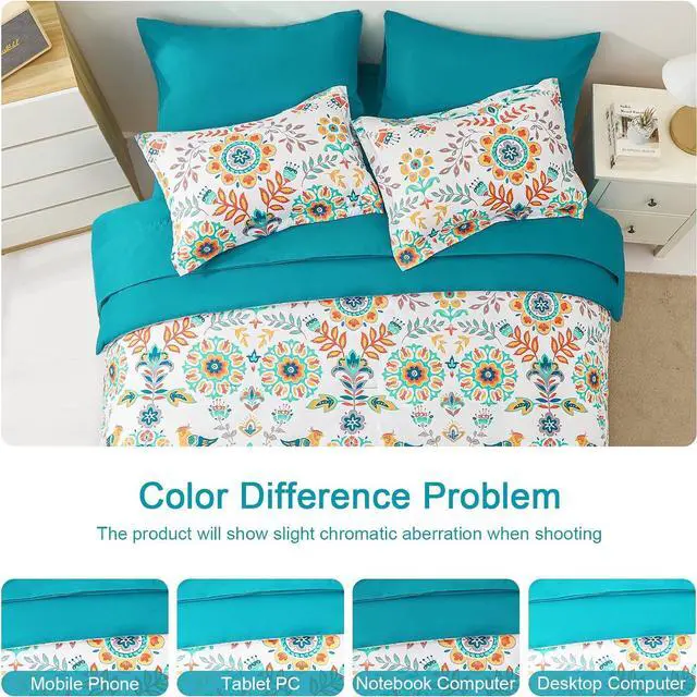 Fashionable Decoration: A vibrant design with this queen bed in a bag. This queen size comforter set with sheets botanical details in shades of blue, yellow, and red on a white background floral medallion and bird print in vivid colors with a solid peacock blue reverse, for a pleasant boho look. Reactive printing technology which has better moisture absorption than ordinary printing, high colorfastness.