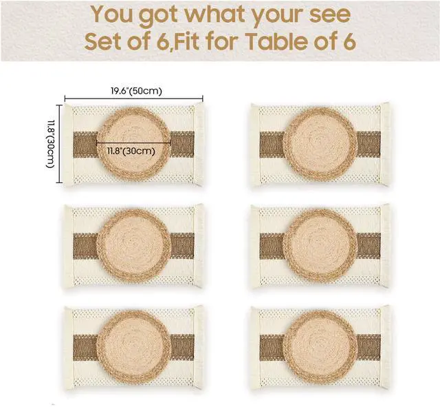 • DIMENSIONS&SPECIFICATIONS - You will receive 6 sets combination placemats. Includes 6 squares and 6 rounds. The square boho placemats measure 11.8"x19.6" and the round woven placemats are 11.8" in diameter. They provide a rustic backdrop that looks good on most tabletops. Also, you can use them individually in order to match different decorative themes