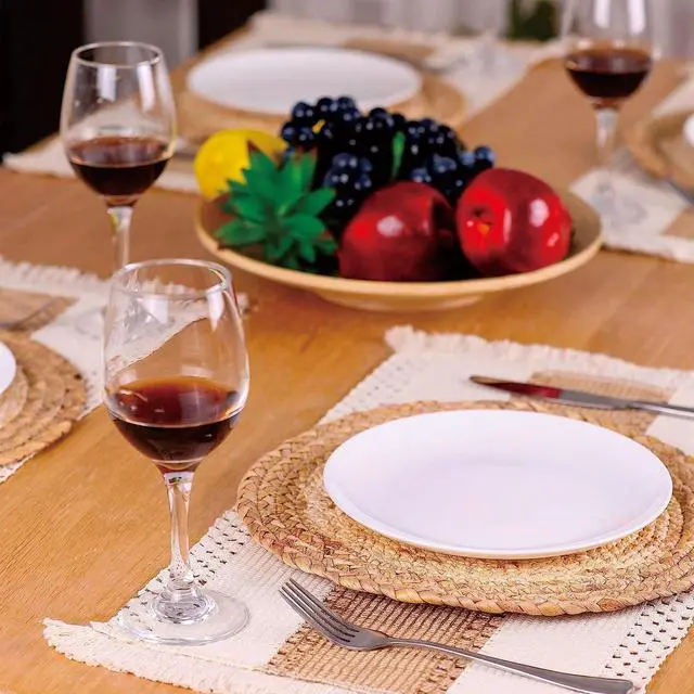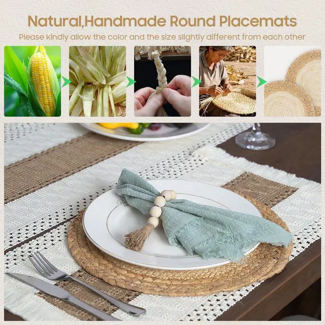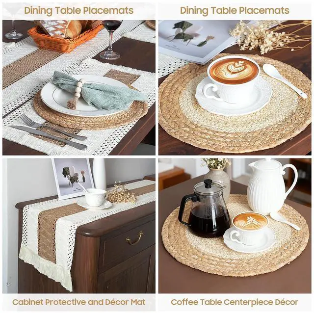 • SUPERIOR QUALITY PLACEMATS: Made of 100% natural materials. Soft skin-friendly cotton with tassels, and hollow stripes woven from burlap, it will add that just right dash of rustic chic decor. And the round placemats are hand-woven from high-quality water hyacinth and corn husk materials, which are non-slip, heat-resistant and anti-scalding while providing maximum protection for your table