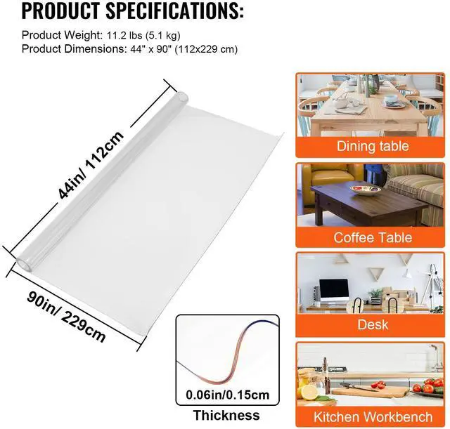Material: PVC Color: Transparent Thickness: 0.06 in / 1.5 mm Shape: Rectangle Max Temperature: 80 °C / 176 °F Item Dimension: 44 x 90 in / 112 x 229 cm Item Weight: 11.2 lbs / 5.1 kg