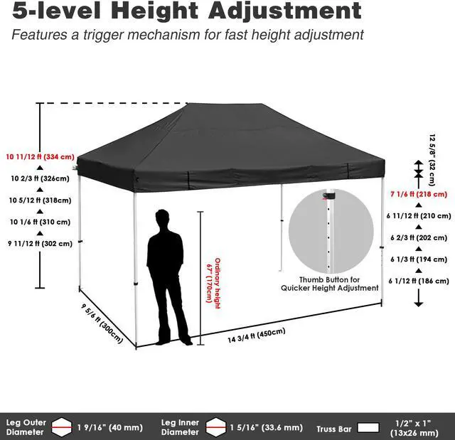 - 5-level Height Adjustment: 9 11/12 ft (302 cm), 10 1/6 ft (310 cm), 10 5/12 ft (318cm), 10 2/3 ft (326cm), 10 11/12 ft (334 cm)