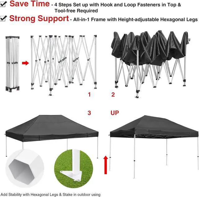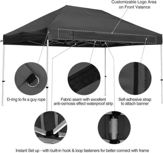 - 10x15ft Large canopy, offers 150 sq. ft. coverage, provides standing room for approx. 25 people or seating room for 19, customizable logo area on front valance for attaching banner