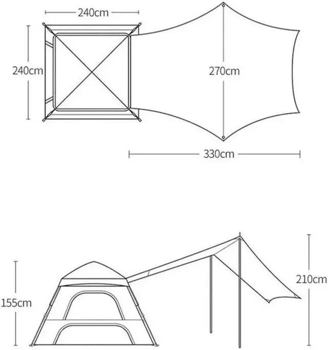 Tent dimension: 7.88 x 7.88 x 5.1 Ft / 240 x 240 x 155cm (LxWxH)