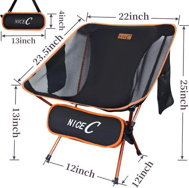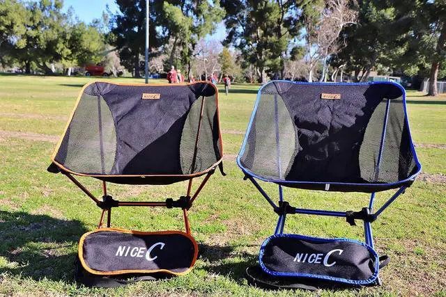 COMFORTABLE DESIGN: Nice Cs Ultralight Camping chair is made with an orthopedic recommended ergonomic design that allows you to sit comfortably and relax. The breathable mesh lets air flow through while you sit. There are 2 side pockets for you to put your phone or drinks. Take this chair with you anywhere: beach, park, camping, hiking, etc.