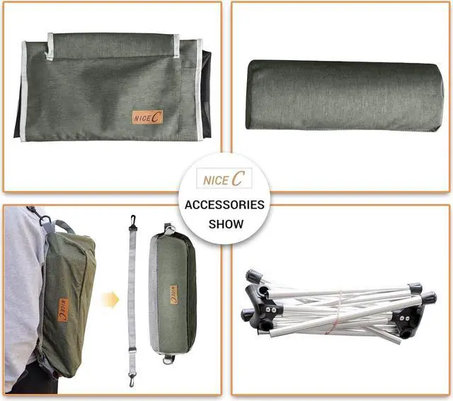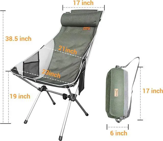 COMFORTABLE DESIGN: Nice Cs high back camping chair is made with an orthopedic recommended ergonomic design that gives you maximum comfort. It comes with a detachable pillow so you can rest your head and neck comfortably. The breathable polyester seat allows for air flow so you stay comfortable during hot climates. Side pockets are attached for easy storage for your water, phone, or snacks. Take this seat anywhere with you: camping, hiking, picnics, festivals, etc.