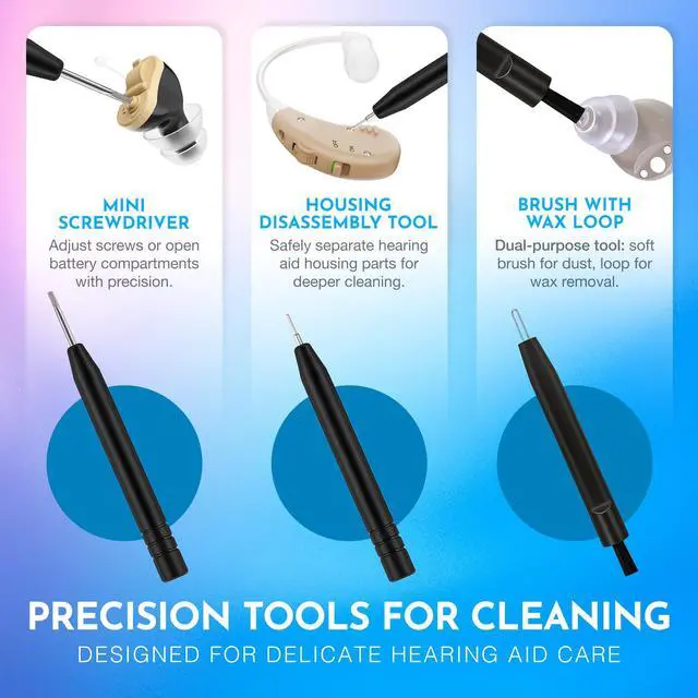 This complete tool set includes a screwdriver, tube brush, housing disassembling tool, cleaning wire, multifunction brushes with wax loops, a cleaning cloth, 10 hearing aid wipes, a magnifying glass, and a zippered carrying case for convenience. Regular use of the kit helps remove wax, moisture, and debris, protecting devices from damage and improving sound clarity and battery life. Built with durable, reusable materials, the soft nylon brushes and specially formulated wipes ensure gentle cleaning without scratches or harsh chemicals. Whether you need daily maintenance, a weekly refresh, or deep cleaning, this kit is perfect for hearing aids, amplifiers, earbuds, headphones, ear molds, and other small electronics. Compact and portable, its easy to carry for quick cleanings wherever you go, helping extend the lifespan of your devices and maintain peak performance.