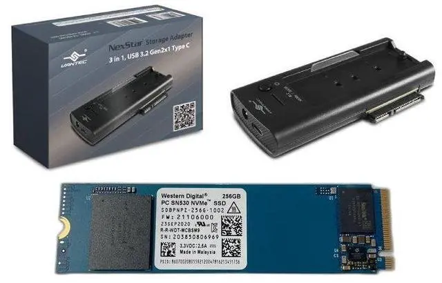 Western Digital PC SN530 (SDBPNPZ-256G) 256GB M.2 2280 PCIe NVMe Internal Solid State Drive (SSD) w/ Vantec CB-NSC300 NexStar Storage Adapter, 3 in 1, USB 3.2 Gen2x1 Type C
