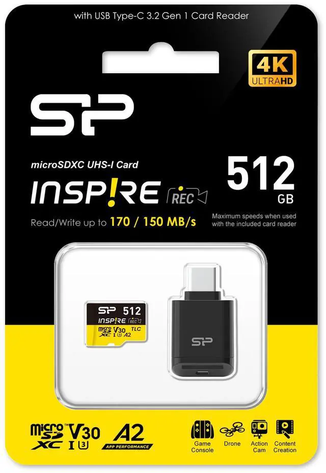 Silicon Power 512GB Inspire UHS-1 (U3) A2 TLC Micro SDXC Memory Card with USB Reader - Model SP512GBSTXLA2VC2