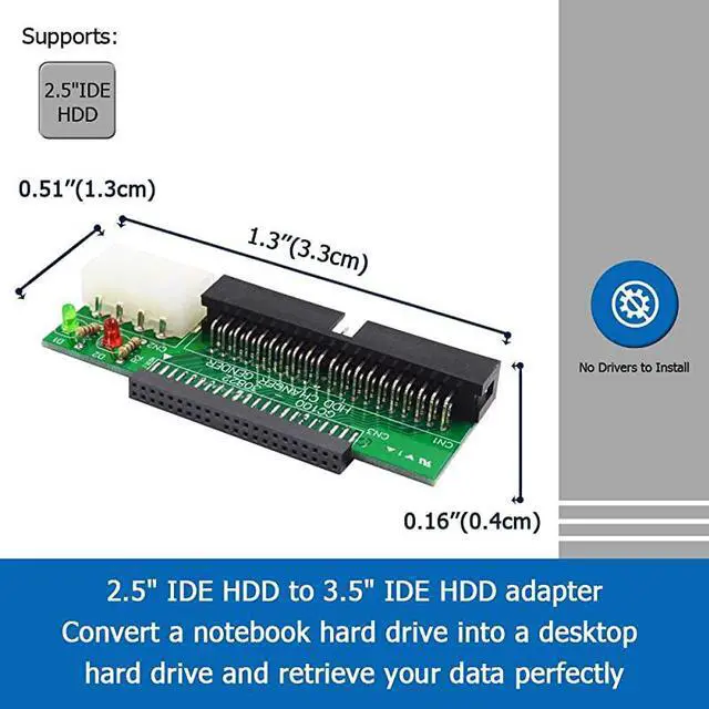 **********Best Quality Guranteed.*****This adapter connect laptop 2.5"" hard disk to desktop PC 3.5"" hard disk socket.*****On one end it is IDE hard drive 40-pin male connector, on the other end it is Laptop hard drive 44-pin female connector.*****2.5" Laptop IDE : 44-Pin Female;3.5" Desktop IDE : 40-Pin Male ;Power Supply : 4 Pin IDE.*****Convert a notebook hard drive into a desktop hard drive.Perfect to retrieve your data and prefer notebook hard drive in your desktop system.*****Dimension: 3.3" * 1.3" * 0.4"(L * W * H)