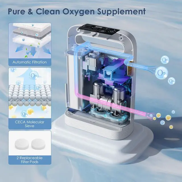 • Clean Oxygen Supplement: Our home oxygen concentrator features a high quality CECA molecular sieve and undergoes a rigorous self-filtration process to purify oxygen before being finally delivered to users, ensuring every breath you take is pure and clean. 2 filter pads are included for easy replacement