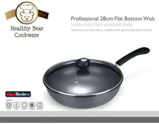 To create delicious cuisine from East or Southeast Asia, you will need a high-quality wok that functions well with your stovetop. A wok is most commonly used for stir frying, deep frying, steaming, simmering or braising. The type of wok you need depends on the quantity of food you intend to make. The Healthy Bear Hard Anodized Wok series features different sizes to allow you to select the perfect size wok for your cooking needs.Healthy Bear Hard Anodized Professional non-stick pots and pans offers the fast and even heating characteristics of plain aluminum cookware, but with much more strength and durability.What is "Hard Anodized"?Companies created a "hard anodizing" aluminum for cookware using an electrochemical method for preparing raw aluminum that was developed by NASA for the aerospace industry. The result of the electrochemical process changes the outside surface of the material, giving it a non-reactive and extremely hard oxide coating. In fact, anodized surfaces are twice as strong as stainless steel. In addition, the optimal heat distribution cooks food quickly and evenly.Newer and Tough-as-nails QuanTanium® Non-Stick CoatingThe Healthy Bear Hard Anodized Professional Cookware Series also features the newer and tougher QuanTanium® coating. QuanTanium® is an internally reinforced, waterborne, multicoat. It incorporates a unique mix of titanium particles blended into the coating that stands up to almost anything. The excellent scratch resistance produced by the incorporation of titanium particles causes the coating to be harder and more durable than conventionally reinforced systems.Tips & Tricks on how to get the most from your Healthy Bear Hard Anodized QuanTanium® Cookware:Before using the cookware (or any other non-stick cookware) for the first time, wash it to make sure it is clean.Always use low or medium heat when cooking food. This helps preserve the nutrients in food (many of which are fragile and easily damaged when heated to extremes). It also helps to preserve the non-stick surface.While the QuanTanium® surface is designed to stand up to rough treatment, all non-stick cookware will last longer if you are careful not to stab the surface with a sharp point or cut foods with a knife while in the cookware.Do not overheat empty cookware. Always be sure that oil, water, or food materials are in the cookware prior to heating it.Avoid using the cookware as a food storage container, its always better to keep the cookware clean when not in use.Always allow cookware to cool before immersing it in water.Your new Healthy Bear Hard Anodized QuanTanium® Cookware is perfectly safe to put into the dishwasher, but the QuanTanium® surface is so easy to clean that a quick handwash does the trick.If, through misuse, burned grease or food residue collects on the surface, it can usually be removed by warm water and a mild detergent. In an extreme case, such residue can be removed by a thorough cleaning with this solution: 3 tablespoons bleach, 1 tablespoon liquid dish detergent, and 1 cup water. Apply to cooking surface with a sponge. After cleaning, recondition the surface with a light wipe of cooking oil.Product Features:Durable non-stick QuanTanium® coating: reinforced with titanium for use with metal utensils.Hard Anodized Aluminum outer housing makes the cookware twice as strong as stainless steel with optimal heat distribution to cook food thoroughly and evenly.Suitable for all cooktops except induction.Bakelitel handle allows cookware to be handles after hours of stovetop cooking.Glass lid with steam vent included for see-through convenience and attractive presentations.28cm diameter: perfect size for everyday stir-frying.The new QuanTanium® coating allows the cookware to be dishwaher-safe