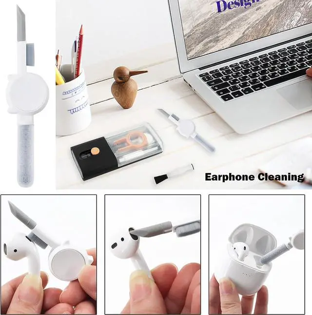 Integrated laptop and earphone cleaning tools, including Airpod 3 in 1 cleaning pen with silicone clip, brush specially used for cleaning camera lens, plastic keyboard clip, flocking sponge brush, screen cleaning solution spray, retractable keyboard brush, Mobile card opening tool and soft plush glasses cleaning cloth. It is used to remove dust, wax, and dirt, and to disinfect and clean Airpod mobile phones, laptop, computers, PCs,ipad.