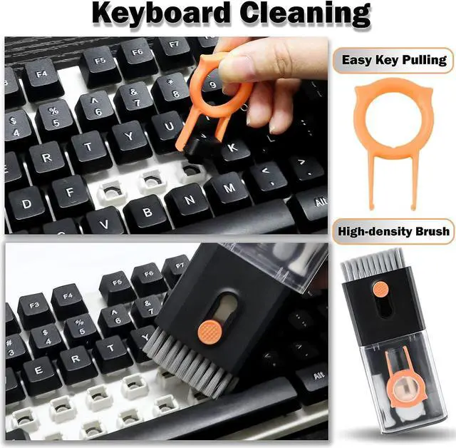 key cap for cleaning the keyboard. The bottom of the keyboard can be easily cleaned with a simple key extractor. High density brushes are large and sturdy,easy cleaning of keyboard gaps, desktop, etc. The retractable soft and hard brush of the professional keyboard cleaning kit is suitable for laptops and keyboards, while the mini high-density brush is ideal for deep cleaning between keyboard keys, used for cleaning between flat keys on laptops.