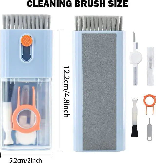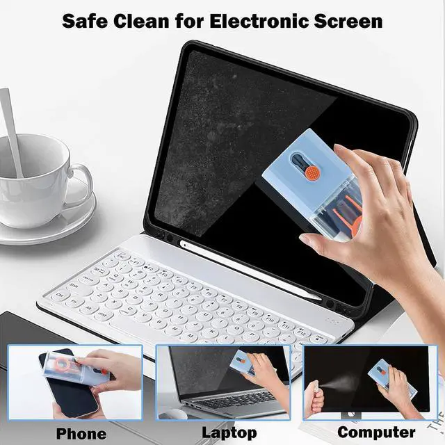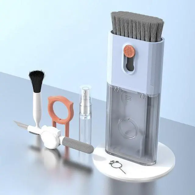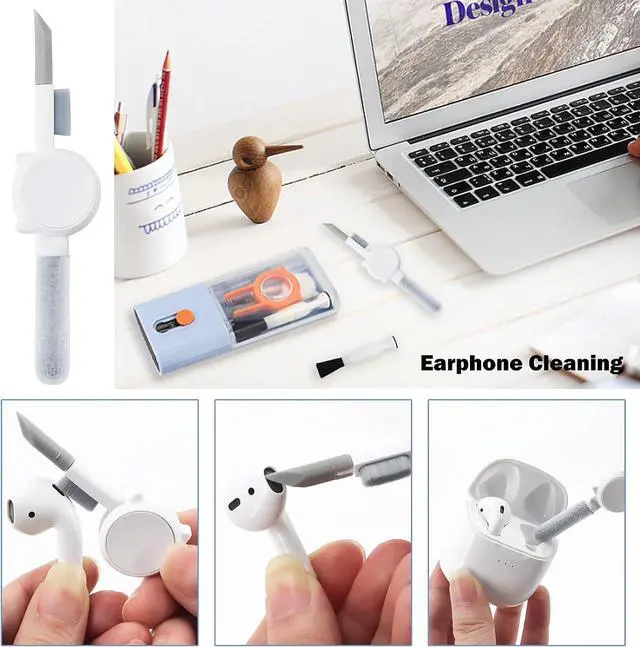 Integrated laptop and earphone cleaning tools, including Airpod 3 in 1 cleaning pen with silicone clip, brush specially used for cleaning camera lens, plastic keyboard clip, flocking sponge brush, screen cleaning solution spray, retractable keyboard brush, Mobile card opening tool and soft plush glasses cleaning cloth. It is used to remove dust, wax, and dirt, and to disinfect and clean Airpod mobile phones, laptop, computers, PCs,ipad.