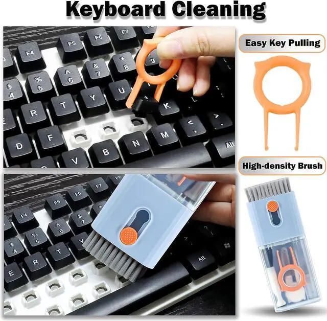 key cap for cleaning the keyboard. The bottom of the keyboard can be easily cleaned with a simple key extractor. High density brushes are large and sturdy,easy cleaning of keyboard gaps, desktop, etc. The retractable soft and hard brush of the professional keyboard cleaning kit is suitable for laptops and keyboards, while the mini high-density brush is ideal for deep cleaning between keyboard keys, used for cleaning between flat keys on laptops.