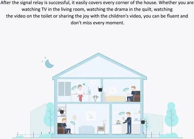 2.When the signals of toilet, balcony and bedroom can't meet the demand of Internet access, we can arrange the successful amplifiers in pairs according to the actual situation and place them between the main router and the weak signal area in turn, which can effectively help the router to improve the WFi coverage effect of the second pairing without repeating settings, and move around at will to enjoy WiFi expansion. Exhibition experience.