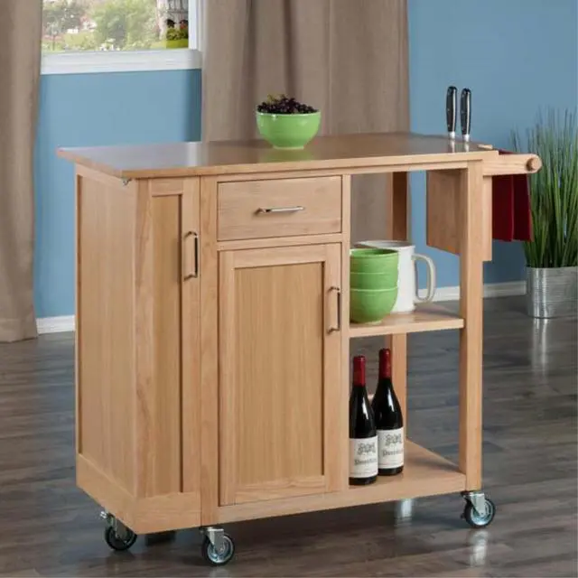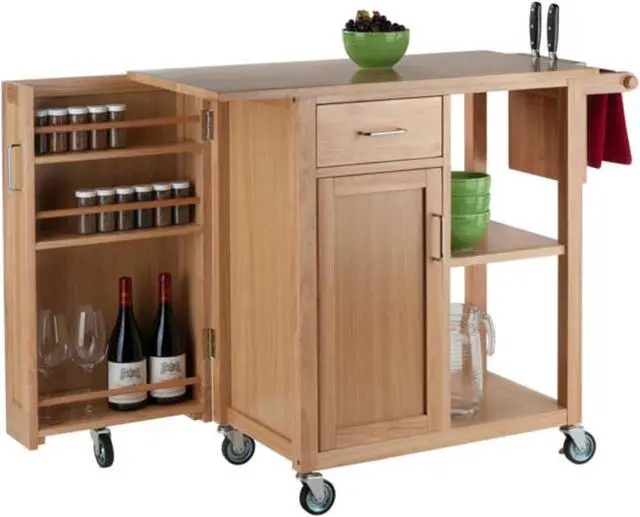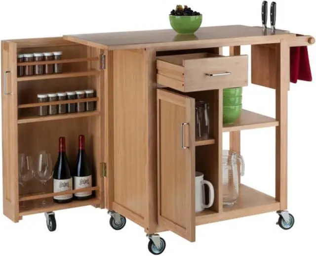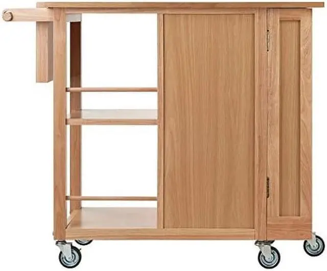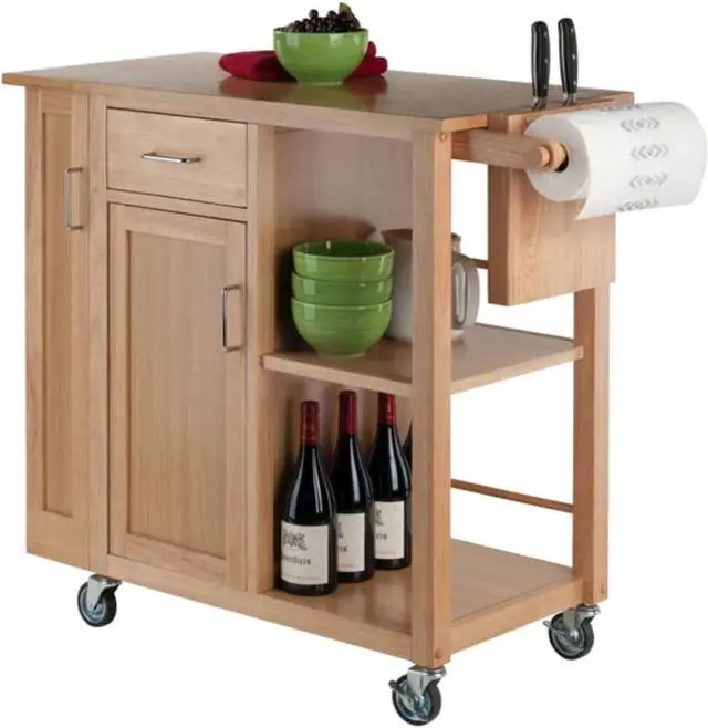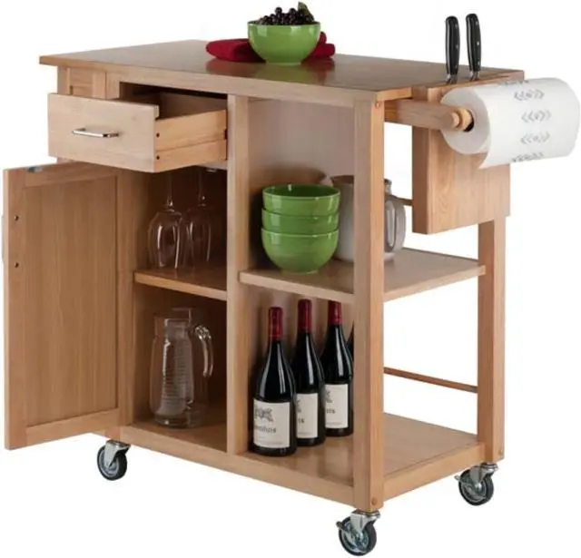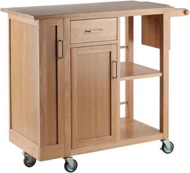 Bring out your inner professional chef with the Douglas Kitchen Cart. In a beautiful Natural Wood, the cart has everything you need for movable meal preparation. Use it in the kitchen for extra work and storage space or roll it out to the deck or patio for a picnic. The natural wood of the tabletop can be used as a cutting board. The cart also features a swing-door cabinet with a stabilizing 5th wheel and a locking device to keep the cabinet securely closed while moving. Inside the swing-cabinet are three side racks, each with a protective bar, perfect for keeping wine, spices, canisters, or bottles of vinegar and oil. There is also a center cabinet with removable shelf providing convenient access to a food processor or serveware. Two open shelves built into the right side of the cart are ideal for bowls, plates and cups. Adding a drawer for utensils, a built-in knife block, and a push handle that can hold kitchen towels or a roll of paper towels, gives you the ideal time-saving workstation at your fingertips. The cart rolls easily on professional-grade casters with two locking wheels to keep the unit stable while in use. Made of Solid and Composite wood. Overall dimensions: 36.6"W x 18.5"D x 35.3"H Swing Door Cabinet (with lock): Stationary shelves 15.3"W x 4"D Top Shelf: 5.9"H Middle Shelf: 6.6"H Lower shelf: 15.75"H Cabinet dimensions: 11.9"W x 15.75"D With shelf in place (shelf is removable, but not adjustable): Upper shelf clearance: 10.1"H Bottom shelf clearance: 11.7"H Open shelves: 13.1"W x 15.75"D Upper shelf clearance: 14.8"H Bottom shelf clearance: 13.8"H Inside drawer dimensions: 10.87"W x 10.94"D x 3.43"H Knife Block dimensions: 10.3"W x 11"H (three knife slots) Assembly required Ships in 1 box