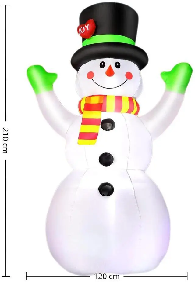 Bring the magic of winter to your yard with this 7 7-foot inflatable Snowman, designed to charm neighbors and delight guests. Featuring a friendly smile, black top hat, and striped scarf, it adds joy to any holiday setting. Internal LED lights illuminate the snowman for a warm glow at night, perfect for creating a festive atmosphere.