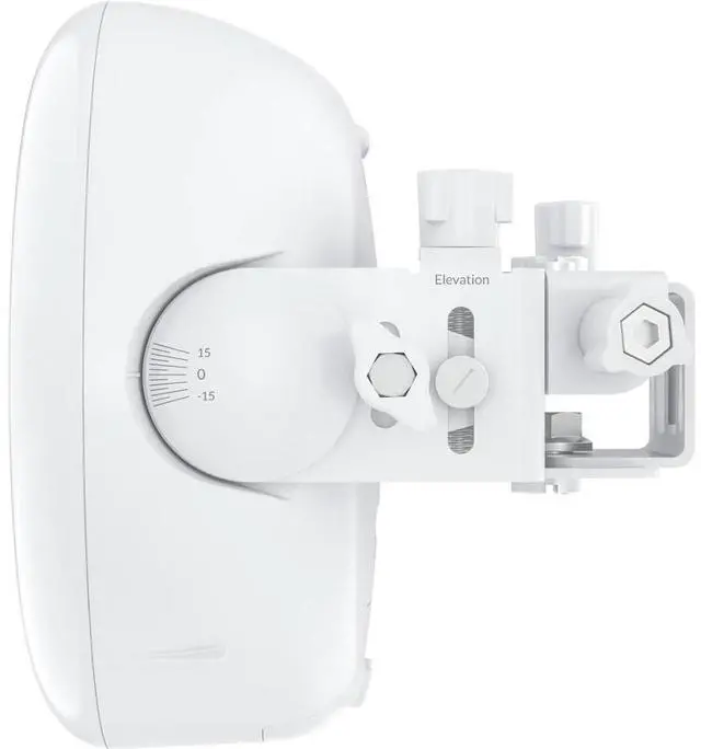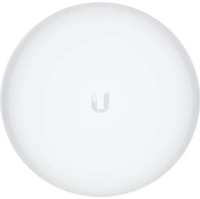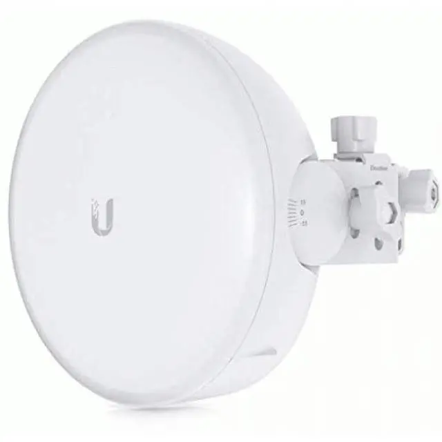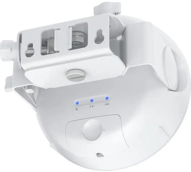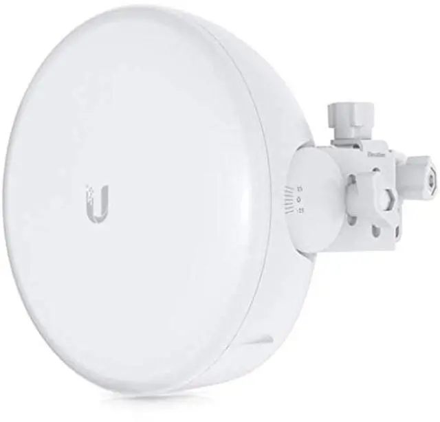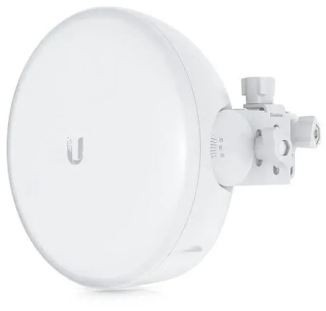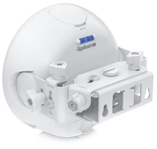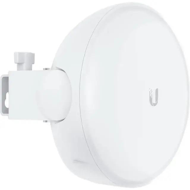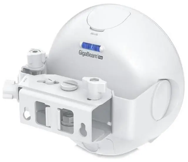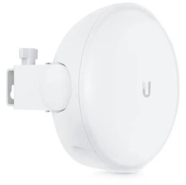 This outdoor radio features a 35 dBi antenna with an integrated Cassegrain reflector that provides over 1.5 Gb/s bi-directional performance over the 60 GHz frequency for low-latency connections at a range of up to 0.9 miles. The airMAX GigaBeam Plus comes with a pole-mounting kit for flexible placement options and can be powered using the included 24 VDC PoE adapter or by connecting it to a compliant network switch. Made from UV-resistant polycarbonate and stainless steel, this radio can be mounted onto a wall or a pole using the included kit. It is built with 24kV ESD/EMP protection and can withstand temperatures between -40 and 140°F in addition to wind speeds of up to 125 mph. Quickly configure, monitor, and manage the airMAX GigaBeam Plus using the Ubiquiti UISP via Bluetooth or online portal.
