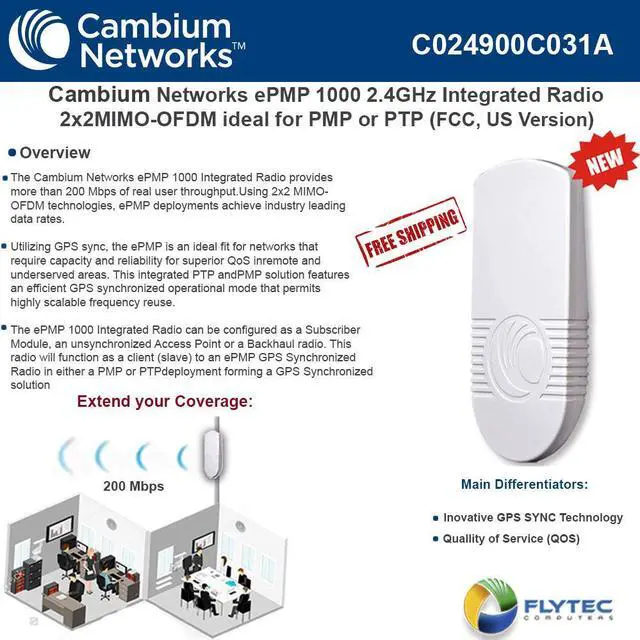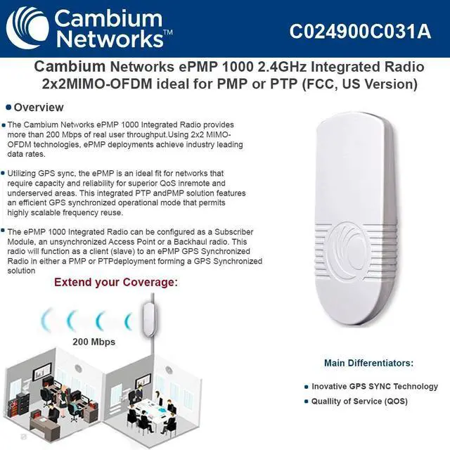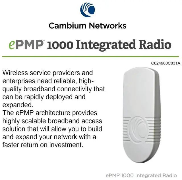 Wireless service providers and enterprises need reliable, high-quality broadband connectivity that can be rapidly deployed and expanded. The ePMP architecture provides highly scalable broadband access solution that will allow you to build and expand your network with a faster return on investment. Cambium Networks' radios deliver bandwidth-intensive services such as VoIP, video and data to end users in multiple vertical markets, with high performance and exceptional reliability. Using the 5 GHz frequency spectrum, the new ePMP architecture is the most effective connectivity solution for reaching the under- and unconnected around the world.
