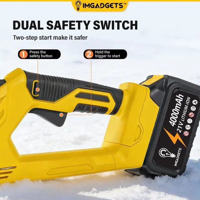 - Safe & Reliable Operation: The IMGadgets cordless electric snow shovel meets UL safety standards and features a dual safety switch system that helps prevent accidental start-ups. It is designed with a dual safety system that requires both the safety switch and trigger switch to be pressed simultaneously, preventing accidental start-ups and ensuring safe operation for all users.