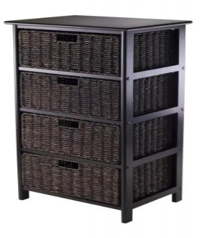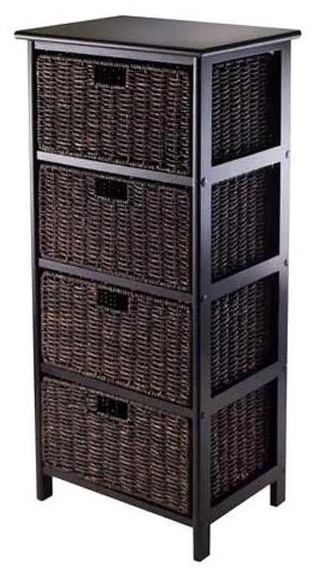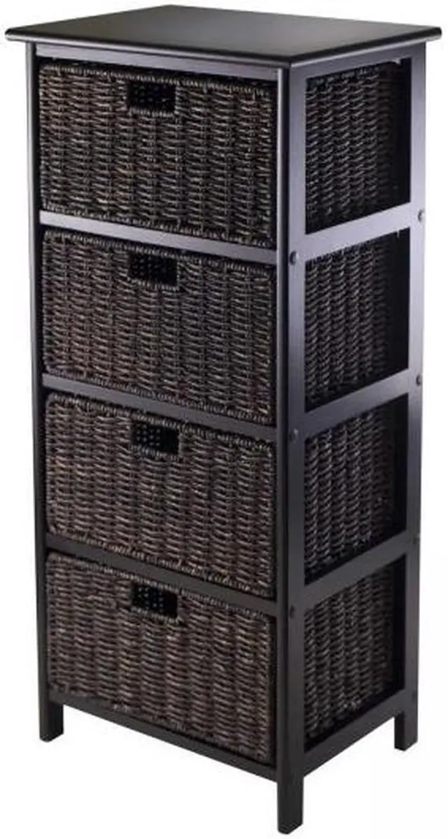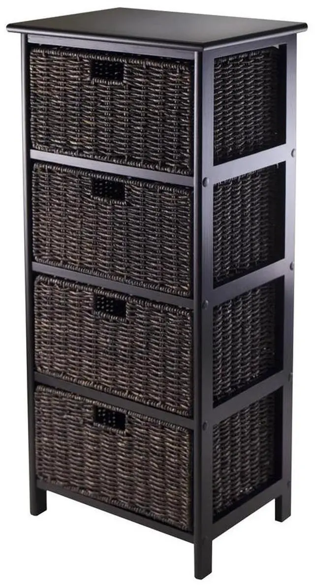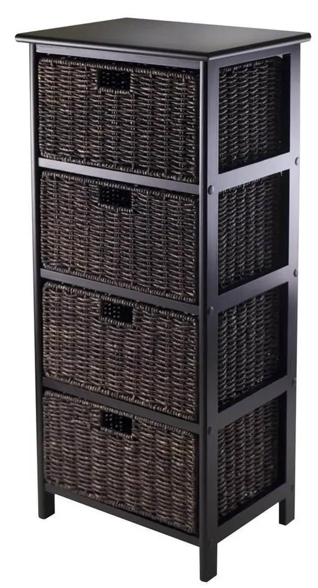 The Omaha Storage Rack with 4 Baskets by Winsome is great for organizing linens in the bathroom, clothes in the bedroom, office supplies, crafts and more! Constructed of solid and composite wood, the modern black shelf includes four storage baskets that are removable and folding. Made of corn husk, the shelf baskets measure 13.98"W x 10.63"D x 7.48"H when open and 23.03" x 9.84" x 1.97" when folded.