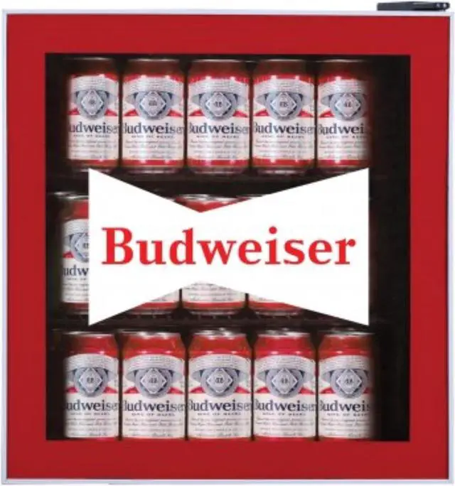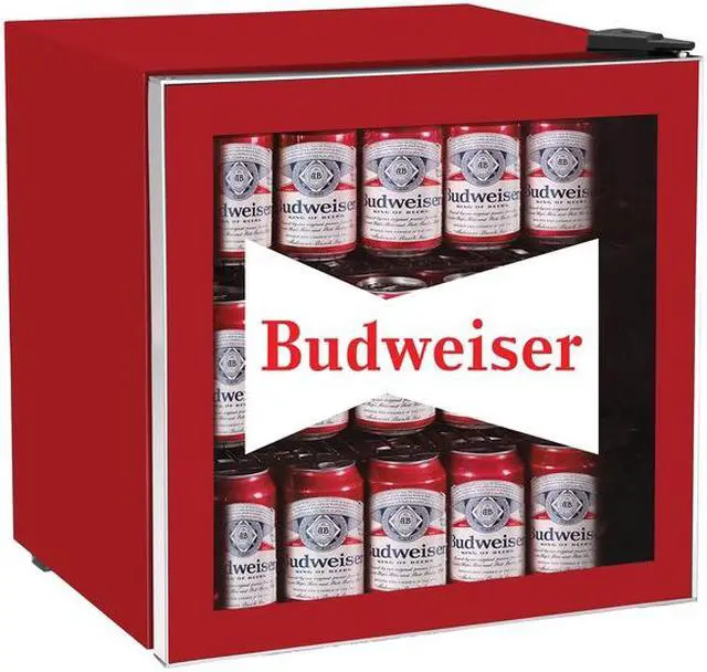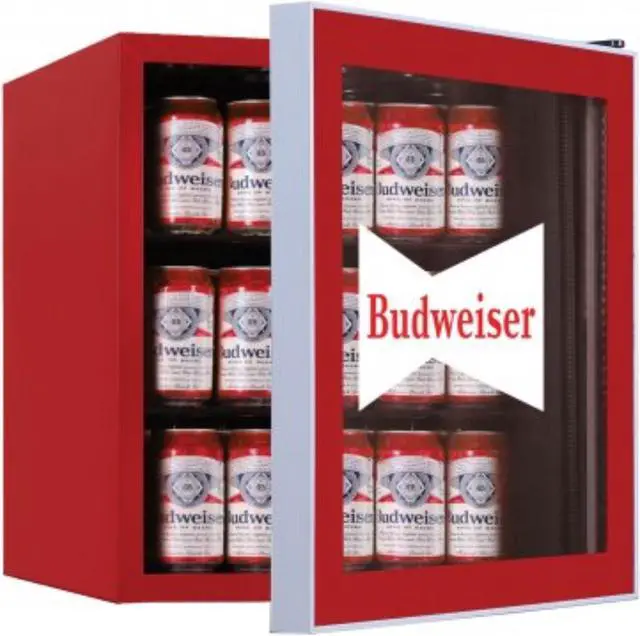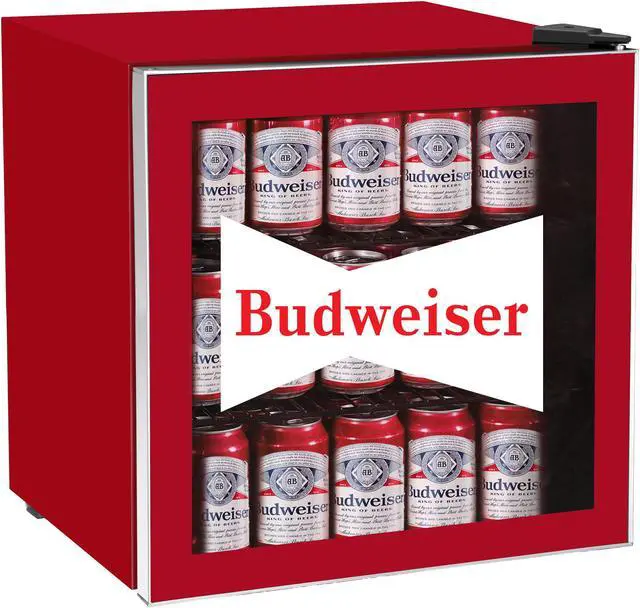 DESCRIPTION Keep up to 70 cans or 17 bottles cool with your stylish Budweiser bar fridge. Perfect for your basement, home office, game room, man cave, or entertainment centre, the Budweiser beverage centre bar fridge holds up to 70 cans or 17 bottles. With reversible glass door, keep all your drinks easily available and cold thanks to the adjustable thermostat which has a cooling range of 4 degrees C - 16 degrees C.